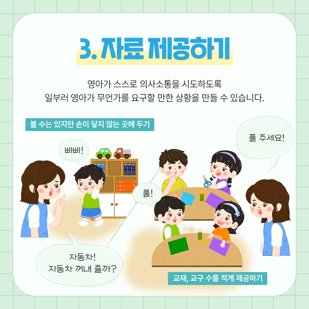 ‘2세 실행자료’는 해설서에 근거하여 2세의 연령별 특성을 고려한 맞춤형의 보육과정 실행을 지원하는 자료입니다.